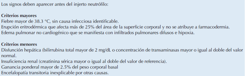 La manifestación de fiebre o eritema previos a la recuperación de la cuenta absoluta de neutrófilos (que se define como injerto) es una alteración denominada síndrome de pre-injerto.11 La incidencia reportada varía de 20-77% de quienes reciben trasplante de progenitores hematopoyéticos, principalmente alogénico, aunque existen reportes esporádicos de trasplante de progenitores hematopoyéticos de tipo autólogo. Los factores de riesgo para su aparición y fisiopatología son poco claros; no obstante, la mayoría de los investigadores señala que es más común después de recibir el acondicionamiento mieloablativo, además de su relación con elevado riesgo de enfermedad injerto contra huésped aguda.12 El diagnóstico de la enfermedad se establece por los hallazgos clínicos, mediante los criterios de Spitzer, incluso no debe haber recuperación en la cifra de neutrófilos al momento de la aparición de los síntomas.13 Deben considerarse tres criterios mayores, o dos criterios mayores y uno o más de los criterios menores, sin características clínicas ni patológicas de síntomas y signos de enfermedad injerto contra huésped, infección y, en caso de afectación de la piel, farmacodermia.13 Por lo anterior, la utilidad del estudio histopatológico radica en establecer el diagnóstico diferencial con estas últimas alteraciones. Cuadro 1