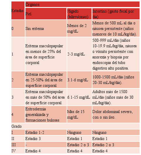 Uno de los principales obstáculos para alcanzar el éxito del trasplante de progenitores hematopoyéticos es la enfermedad injerto contra huésped, que provoca un estado inflamatorio, con subsiguiente lesión y destrucción de los tejidos sanos en el receptor; además, la evolución y tratamiento pueden indicarse de por vida. Esta complicación, asociada con el trasplante de progenitores hematopoyéticos, puede afectar a 60% de los casos con trasplante alogénico, cuando se indica un régimen de acondicionamiento mieloablativo.14 La gravedad de la enfermedad injerto contra huésped se determina por el grado (o estadio) de afectación de los órganos blanco (piel, hígado y tracto gastrointestinal superior o inferior), de acuerdo con los criterios aceptados, que principalmente incluyen la extensión del eritema, magnitud de la hiperbilirrubinemia y volumen de la diarrea. De esta forma, la afectación de la piel, el hígado y tubo digestivo se utilizan para determinar la gravedad de la enfermedad injerto contra huésped, según los criterios de Glucksberg. Cuadro 2