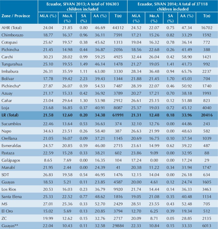 The frequency of anemia in Ecuadorian children between 6 and 59 months was calculated using the data published by the Nutrition Unit, Ministry of Public Health of Ecuador. This information was compiled through the Integrated System of Food and Nutritional Surveillance (Sistema Integrado de Vigilancia Alimentaria y Nutricional, SIVAN) (https://www.salud.gob.ec/unidad-de-nutricion/),[13] which is actualized every day by physicians working throughout the country. During the time of this study, published information for 2013 and the first trimester of 2014 was available. However, the report of the non-delimited Areas (NDA) which was also published was not included. To obtain this data, firstly, we enter into the website provided.