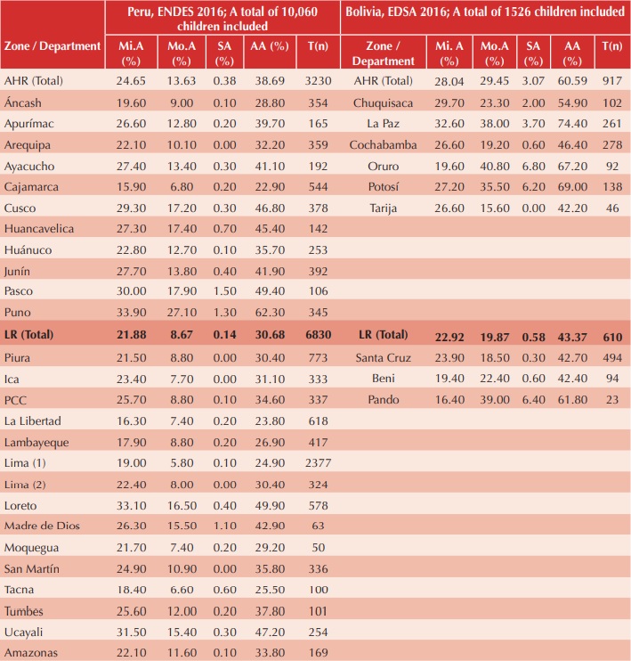 In the Bolivian children, we found anemia being more frequent in the AHR (60.59%) compared to LR (43.37%). The five departments more affected by this condition were La Paz (74.40%), Potosí (69.00%), Oruro (67.20%), Pando (61.80%) and Chuquisaca (54.90%). And as was observed in Ecuador and Perú, among the departments located in the LR, the highest percentage of anemia was found in Pando which is located in the AR.