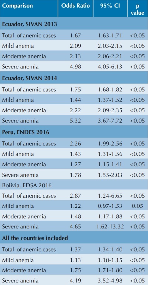MATERIALS AND METHODS: A transversal descriptive study based on the risk association of anemia in children between 6 and 59 months living in the Andean region, through a secondary source published by institutions of health from Ecuador, Peru and Bolivia.