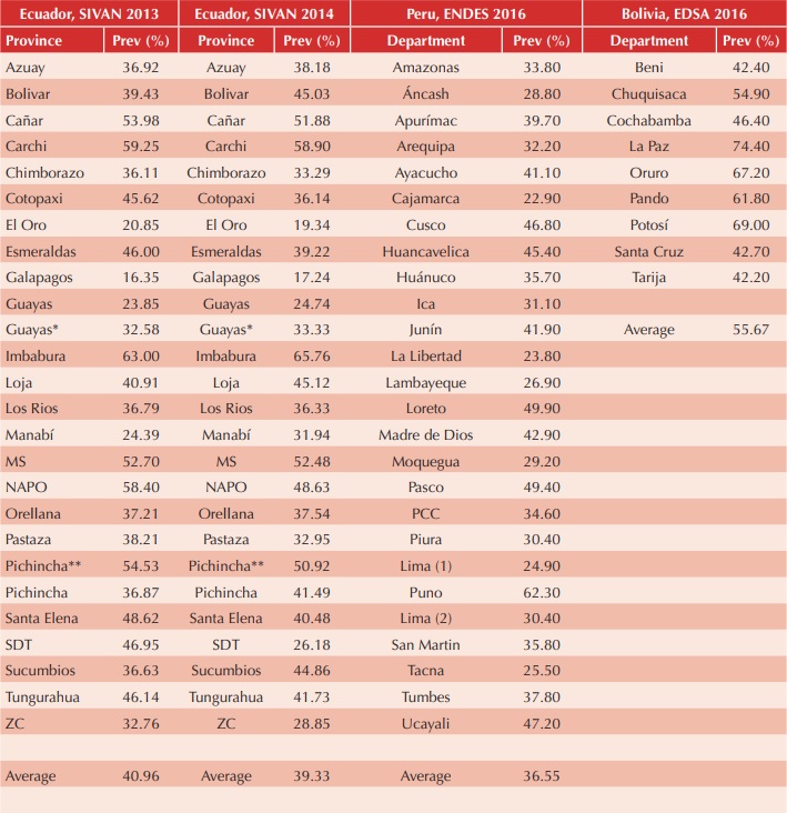 Anemia can be classified as a PHP based on the degree of its prevalence as mild (between 5 and 19.9%), moderate (between 20 and 39.9%) and severe (higher or equal to 40%). The findings of this study showed that while anemia was frequently a moderate or severe problem in a majority of the provinces or departments of Ecuador and Peru, in all the Bolivian regions it was a severe problem (Table 4).