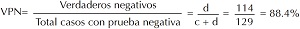 Valor predictivo negativo (VPN). Probabilidad de que un paciente no tenga la enfermedad si una prueba resulta negativa. Es igual a los ver- daderos negativos (= d) entre el total de los casos con prueba negativa (= c + d): d/(c + d).