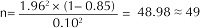 El cálculo del tamaño de la muestra más sencillo es el que consiste en determinar la cantidad de casos necesarios para construir un intervalo de confianza de cierto nivel, digamos, de 95%. Cuando se introdujo el concepto del IC nos referimos al Cuadro 1e hicimos un pequeño ejercicio de calcular el error estándar y el intervalo de confianza de 95%. En la tercera columna del mismo cuadro se encuentra una ecuación con el título de “ para IC95%, cuando la prevalencia es conocida”. Es, más que nada, la expresión obtenida despejando la n de la fórmula del IC95%. Ahora suponemos que queremos determinar el tamaño de muestra necesaria para poder estimar la sensibilidad de la prueba diagnóstica con la que creemos que su sensibilidad sea alrededor de 0.85, construyendo un IC95% con una precisión de ± 0.10. Sustituyendo P por el valor hipotético de 0.10 de sensibilidad y , la magnitud de precisión que corresponde a una mitad del rango de IC por 0.10, entonces,