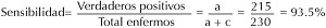 Sensibilidad. Probabilidad de que la prueba sea positiva puesto que se tiene la enfermedad; se refiere al número de casos que caen en la casilla (verdaderos positivos), dividido entre el total de los enfermos (= a + c): a/(a + c) .