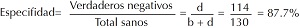 Especificidad. Probabilidad de que la prueba sea negativa puesto que no se tiene la enfermedad. De manera similar a la sensibilidad es la proporción de verdaderos negativos (= d) dividida entre el total de los sanos (= b + d) d/(b+d): .