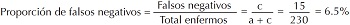 Proporción de falsos negativos. Probabilidad de que la prueba sea negativa porque se tiene la enfermedad. Es igual a falsos negativos (= c) entre el total de los enfermos (=a + c): c/(a + c). Es frecuente que se llame “tasa de falsos negativos (false negative rate)”; sin embargo, de acuerdo con la definición del término, no es una “tasa” sino una “proporción”.[8] Esta proporción se calcula verticalmente en la tabla de contingencia presentada, porque, igual que la sensibilidad es una probabilidad condicionada determinada dentro de la subpoblación “enfermos”. Como esta proporción es la parte complementaria de la sensibilidad también suele expresarse como “1 – Sensibilidad”.