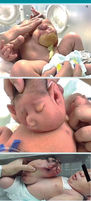 La recién nacida obtuvo una calificación de Apgar de 8/9, peso de 4100 g y talla de 51 cm. A la exploración física se encontró con buen estado general, reactiva, tórax simétrico, con adecuada ventilación y sin dificultad respiratoria; se observó una masa abdominal en la pared anterior, correspondiente a un gemelo siamés, con agenesia casi total, únicamente constituido por la región cefálica y tronco dismórfico. El resto de las estructuras del gemelo sano se observaron sin alteración.