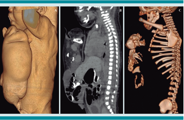 La tomografía computada en plano sagital mostró ambos gemelos con las siguientes características: gemelo parásito (no viable) y dominante (sana) unidos a través de un defecto en la pared abdominal anterior, de aproximadamente 60 x 58 mm, por el que se evidenció el paso de una porción del lóbulo izquierdo del hígado del gemelo dominante, hacia la rudimentaria cavidad abdominal del gemelo parásito. También se observaron algunas asas del intestino delgado y remanentes de colon proximal proyectados hacia el saco abdominal. La tomografía en 3D mostró la imagen del gemelo dominante formado de acuerdo con su edad; sin embargo, el gemelo parásito fue rudimentario, lográndose visualizar porciones de cráneo, la columna, la pelvis y los huesos proximales de los miembros torácicos y pélvicos; en el tórax se observó el corazón rudimentario, formado por una sola cámara cardíaca. Figura 2