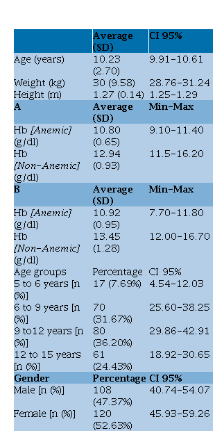 From the review of the IP database, a total of 228 children, between 5 and 15 years of age were included. From a potential group of 267 patients, 39 children were excluded. The exclusion criteria included age outside the interval established for this work, lack of registered anthropometric parameters or absence of the Hb value. Patients possessing a recent diagnosis of infectious disease, any type of cancer, endocrine-metabolic, or any other chronic condition, which could affect the real appreciation of anthropometric measurements, were excluded. No sample size determination was done, as all the children from each school were evaluated during the campaign.