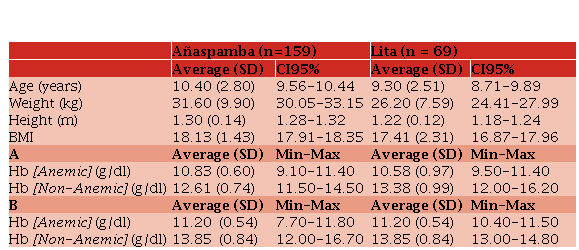 the general characteristics of both groups. The general anthropometric features and Hb average for each group are shown in Table 2. For all the participants, the median age was 10.23 years (CI 95% 9.91-10.61). Besides this, the entire group revealed a similar distribution of participants among all the age groups, with the majority falling in the 9to 12-year age group i.e., 36.20% (CI 95% 29.86-42.91). The female children in the group formed a higher percentage, at 52.6% (CI 95% 45.93-59.26). Higher values for weight, height, and BMI were observed in the group residing at the higher geographic altitude. However, the Añaspamba children in this study revealed a higher average age, with a difference of 1.1 years.