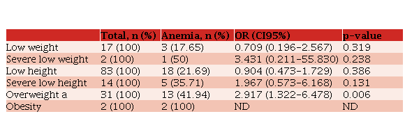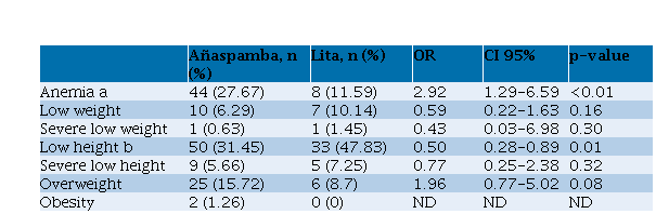 OR, Odds Ratio; CI, Confidence Interval; a Significant value; ND, Not Determined. This table includes the total of children in both groups (Añaspamba and Lita) diagnosed with Low weight, Severe low weight, Low height, Severe low height, Overweight, and Obesity. Furthermore, from these patients, we show the percentage of anemic children.