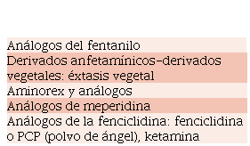 Las nuevas sustancias de las que se habla se describen en la mayoría de los casos como drogas de diseño (síntesis química específica que busca un efecto concreto) y que, en el momento actual, se desconoce su efecto a largo plazo, pero que empiezan a mostrar efectos espectaculares (por decirlo de alguna manera) en la conducta de quien las consume.6Cuadro 2