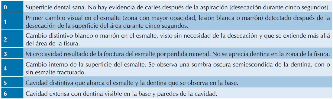 En la etapa inicial la lesión cariosa puede pasar clínicamente inadvertida con la apariencia de una mancha blanca. En la fase inicial debido a la pérdida mínima de minerales la capa superfi- cial de la estructura dentaria intacta se colapsa y produce una cavidad.2 La importancia de la detección oportuna, y de la aplicación de tra- tamientos preventivos y de mínima invasión es evitar, detener o revertir el proceso carioso. Entre las estrategias para prevenir la lesión cariosa está la aplicación de flúor en diferentes presentacio- nes sistémicas y tópicas: geles, colutorios, pastas, espumas y barnices.3