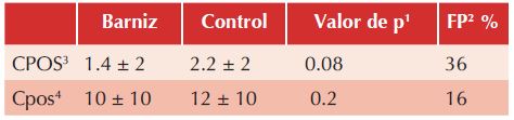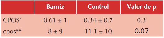 De 106 escolares que terminaron los tratamien- tos, el grupo que recibió barniz de fluoruro de sodio con fosfato tricálcico tuvo menor incre- mento de CPOS que el grupo control (p = 0.087). En el Cuadro 4 se muestran los índices CPOS y cpos finales, así como el factor de protección. Se encontró que el incremento del CPOS fue menor en el grupo que recibió el barniz, sin diferencias significativas entre los grupos.