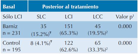 con LCI, en el Cuadro 5 se incluyen los cambios posintervención en los molares diagnosticados solo con lesión cariosa incipiente. El tamaño del efecto para el grupo de barniz fue de 0.15, pues 15% (IC95%: 19-25) se recuperó en com- paración con solo 4% del grupo control (IC95%: 1-6). El porcentaje de molares que evolucionaron a lesión cariosa cavitada (LCC) fue mayor en el grupo control (p = 0.0001).