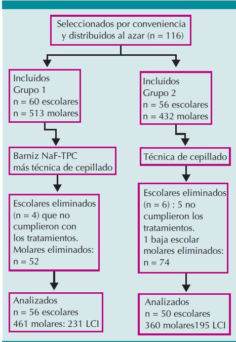 Los índices epidemiológicos de caries basales y la distribución de los molares sanos o con lesiones incipientes de caries se muestran en los Cuadros 2 y 3 sin diferencias estadísticamente significativas entre los grupos en la etapa basal. El flujograma del estudio se muestra en la Figura 1, donde se observa que de los 116 escolares que iniciaron el programa se eliminaron 10 por no cumplir con las sesiones preventivas o por baja. Solo se consideraron 106 para la evalua- ción final.