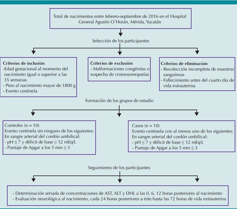 Se estudiaron 20 neonatos que tuvieron algún evento centinela para asfixia neonatal. Los casos (n = 10) tuvieron, además, alguno de los datos clínicos o gasométricos recomendados por el Colegio Americano de Ginecoobstetricia para el diagnóstico de asfixia neonatal; los controles (n = 10) solo tuvieron el evento centinela. Los criterios de inclusión, exclusión y eliminación, así como los procedimientos efectuados se ilus- tran en la Figura 1.