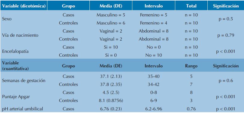 El punto de corte para lactato deshidrogenasa sérica se estableció en 775 UI/L, con sensibilidad de 90% y especificidad de 60% para encefalo- patía hipóxico-isquémica. No se encontraron diferencias estadísticamente significativas entre el grupo de casos y el de controles con respecto a sexo de los participantes, edad gestacional o vía de nacimiento.