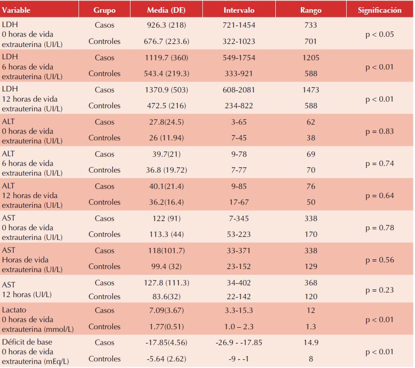 Las concentraciones séricas de lactato tuvieron un comportamiento similar al descrito para la lactato deshidrogenasa. Los casos tuvieron una media de 7.09 mmol/L respecto de los controles, quienes reportaron una media de 1.77 mmol/L (p<0.001). Se obtuvo el mismo grado de signifi- cación al comparar el déficit de base entre casos (media = -17.85 mEq/L) y controles (media = -5.64 mEq/L) (p < .001). No se encontraron diferencias significativas entre casos y controles respecto de los valores de aspartato aminotransferasa (p > 0.1).
