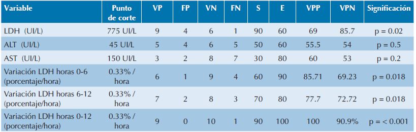 VP: verdaderos positivos; FP: falsos positivos; FN: falsos negativos; VN: verdaderos negativos; S: sensibilidad; E: especificidad; VPP: valor predictivo positivo; VPN: valor predictivo negativo; AST: aminotransferasa de aspartato; ALT: aminotransferasa de alanina; LDH: lactato deshidrogenasa.