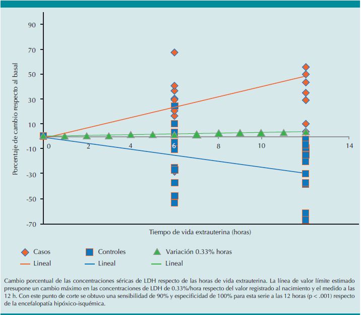 RESULTADOS: El punto de corte para lactato deshidrogenasa sérica se estableció en 775 UI/L, con sensibilidad de 90% y especificidad de 60% para encefalopatía hipóxico- isquémica. Un incremento en los valores séricos de lactato deshidrogenasa igual o superior a 0.33%/hora entre las horas 0 y 12 tuvo sensibilidad de 90% y especificidad de 100% respecto del inicio de la encefalopatía hipóxico-isquémica.