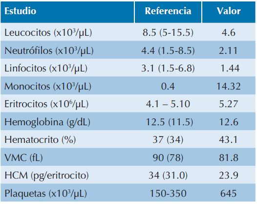 Paciente de tres años, con diagnóstico de leuce- mia linfoblástica aguda L2 Pre B Calla negativo, de riesgo bajo por edad y carga tumoral, que se encuentra en remisión completa continua en su cuarto mes. Tres meses después del diagnóstico inicial se le colocó un dispositivo Port-a-Cath. Al cuarto mes se hospitalizó para recibir el siguiente ciclo de quimioterapia de consolidación, con esquema CAP-VAP (6-mercaptopurina, ciclo- fosamida, citarabina, vincristina). Durante la permanencia en su domicilio no hubo eventua- lidades y la biometría hemática completa solo registró elevación de la cuenta plaquetaria. (Cua- dro 1) Al permeabilizar la vía, el paciente tuvo fiebre, escalofríos, cefalea y dolor abdominal pero permaneció hemodinámicamente estable. Debido a que se sospechó infección relacionada con el catéter se tomó un hemocultivo central y periférico y se inició tratamiento con meropenem (40 mg/kg/dosis) y vancomicina (10 mg/kg/dosis) y se retiró el catéter permanente.