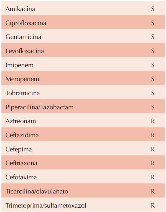 Con los cultivos y antibiogramas se ha podido observar que en la mayoría de los casos repor- tados el tratamiento antibiótico de elección son las nuevas quinolonas (garenoxacina, getifloxacina, levofloxacina) porque tienen una susceptibilidad mayor a 95%, seguidas de trimetoprima-sulfametoxazol con una suceptibi- lidad de 95%, piperacilina-tazobactam con 90% de susceptibilidad; y con 85% de susceptibilidad criprofloxacina, cefepime, ceftazidima, pipera- cilina y rifampicina.8,11