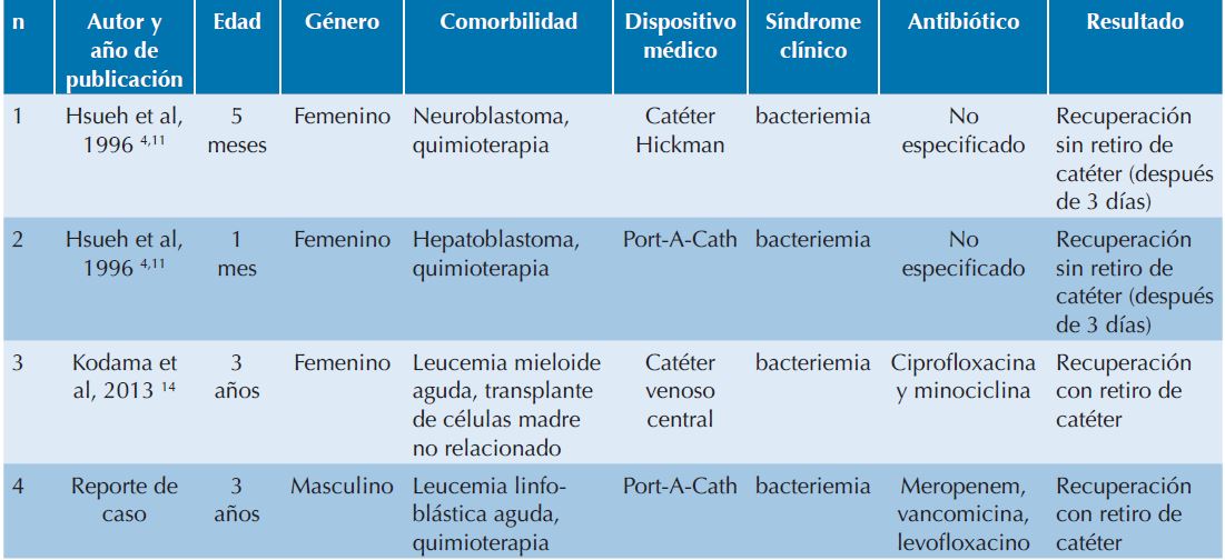 En 2016 Aykac y colaboradores publicaron la recopilación de seis casos en pacientes pediátri- cos de 2012 a 2015, donde uno de sus pacientes tuvo bacteriemia relacionada con el catéter, que al no contar con otra vía de acceso se decidió no remover el dispositivo; a pesar del tratamiento antibiótico al que era sensible el paciente falle- ció. Por eso los autores sugieren que si un catéter está infectado por C. indologenesdebe retirarse cuanto antes.16