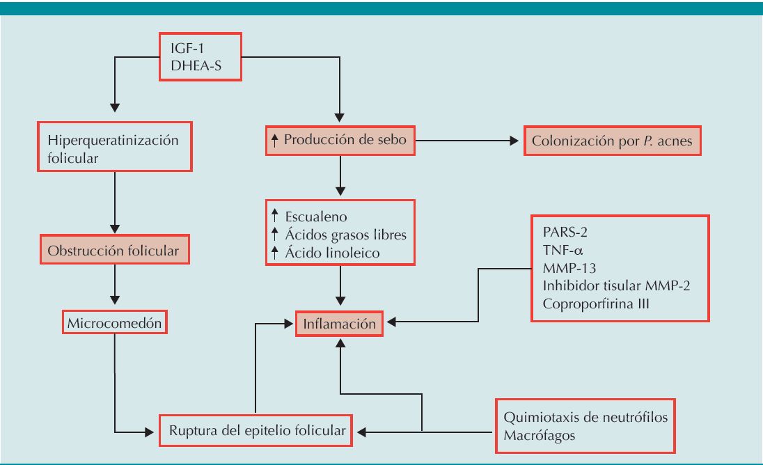 Los cuatro principales factores patogénicos del acné son: hiperplasia de glándulas sebáceas y aumento en la producción de sebo, alteración en la queratinización folicular, colonización por Propioniibacterium acnes e inflamación. La interacción entre estos factores y el acné se esquematiza en la Figura 1.