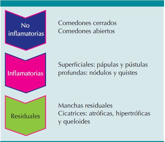 Las lesiones elementales del acné se dividen en tres grupos, que pueden o no concurrir se- cuencialmente: no inflamatorias, inflamatorias y residuales (Figura 2). La piel subyacente es, por lo general, oleosa.