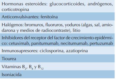 Dermatitis acneiforme. Aparece a cualquier edad, como una erupción monomorfa de pápulas o pápulo-pústulas más frecuentes en el tronco. No hay comedones. La causa más frecuente son los medicamentos, sobre todo los listados en el Cuadro 1.