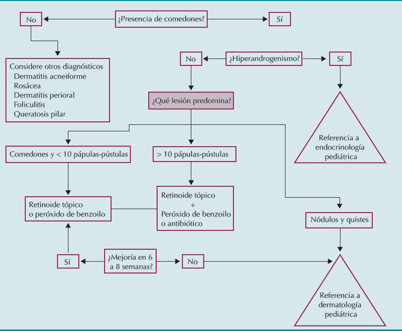 La Figura 6 muestra un algoritmo que puede ayu- dar al médico de primer contacto a la toma de decisiones en un adolescente con acné juvenil.13