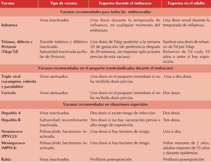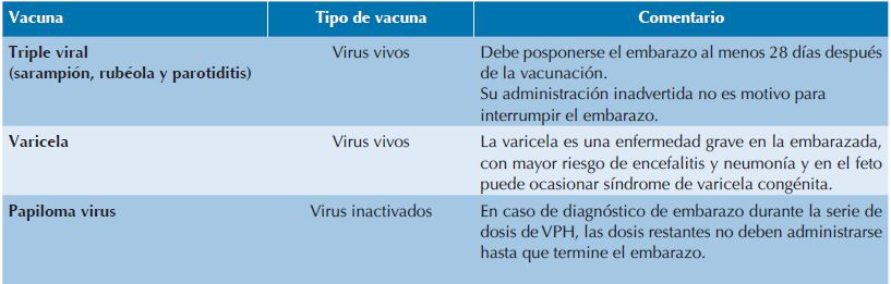 Algunas otras vacunas contraindicadas durante el embarazo son BCG e influenza intranasal y la de virus vivos atenuados. Cuadro 2 y 3