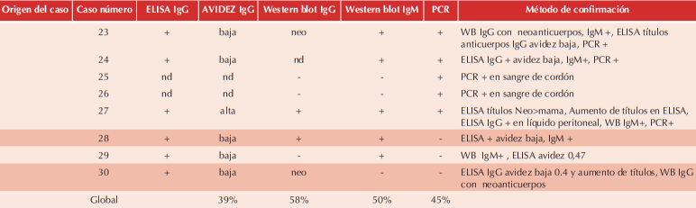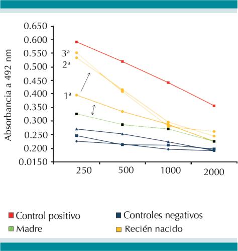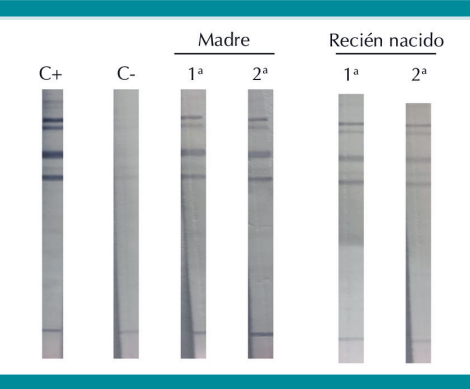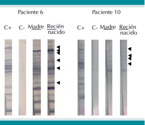 En cuanto a los niños con infección congénita, los resultados resaltan la importancia de combinar varios métodos de diagnóstico, y se puede recurrir a pruebas simultáneas de ELISA, western blot y PCR, o en algunos casos, a la titulación de muestras seriadas para anticuerpos IgG y de comparación de títulos entre madres e hijos. Además, el encontrar diferentes subclases de anticuerpos IgG entre madre e hijo en ELISA podría apoyar el diagnóstico de certeza, pero falta establecer su utilidad.23, 24