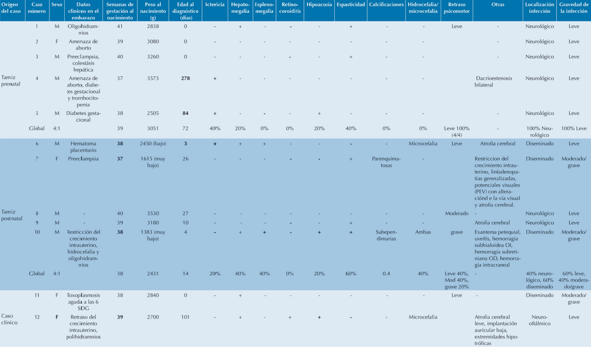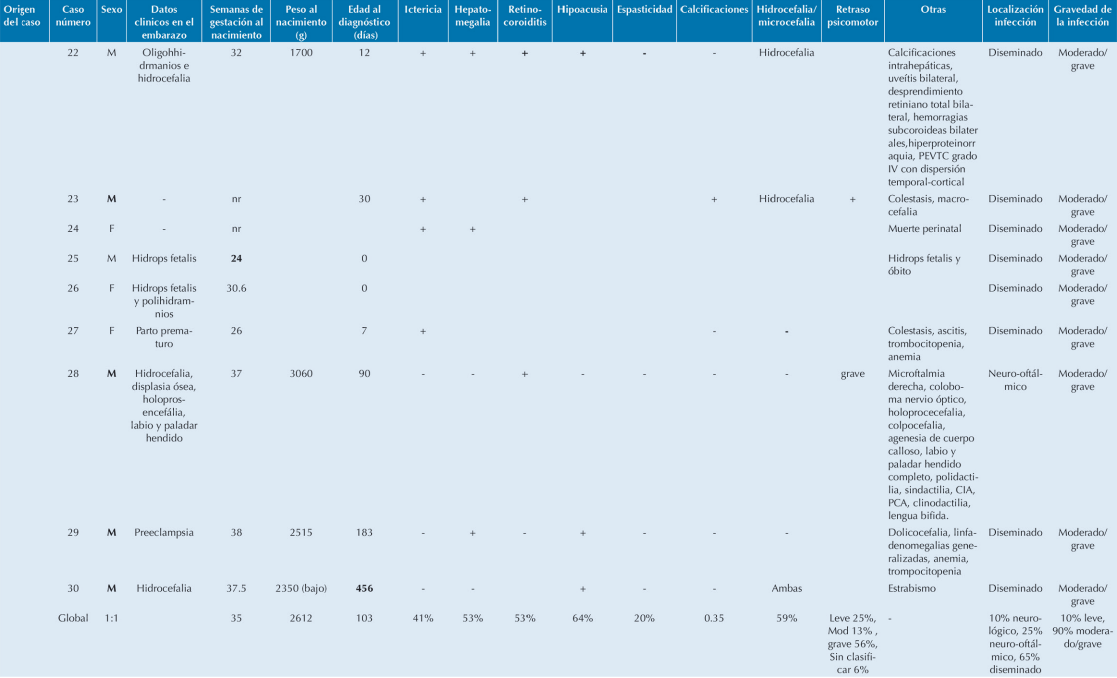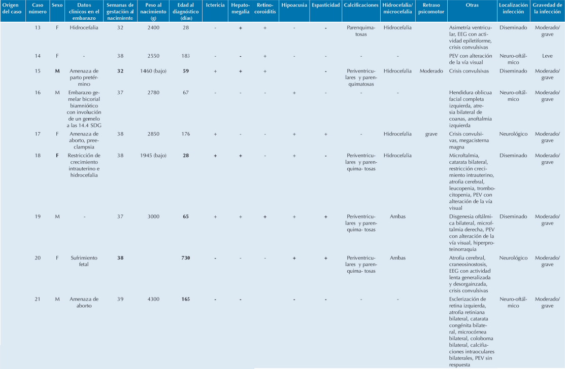 Los pacientes con manifestaciones clínicas moderadas/graves presentaron bajo peso al nacer para la edad gestacional, ictericia, hepatomegalia, esplenomegalia, retinocoroiditis, hipoacusia, espasticidad, uveítis, catarata, microcefalia, hidrocefalia, calcificaciones intraparenquimatosas difusas, EEG anormal, crisis convulsivas, trombocitopenia, anemia y/o retraso psicomotor grave; además, algunos de ellos murieron.