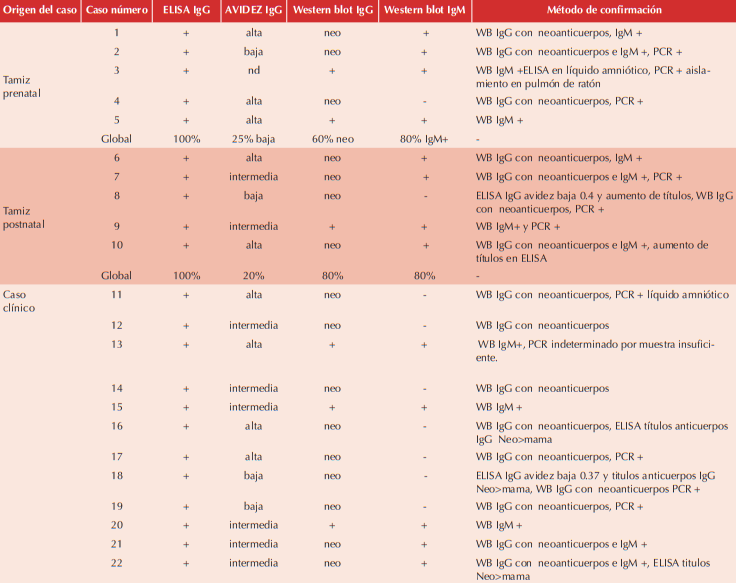El diagnóstico laboratorial de toxoplasmosis congénita no es fácil debido a la posible variedad de resultados, como se muestra en esta serie de casos. Por ejemplo, en cinco pacientes, el ELISA fue positivo para IgG, con anticuerpos IgG e IgM positivos mediante western blot, pero la PCR fue negativa, algo que puede explicarse por la naturaleza intracelular del parásito, por lo que no necesariamente circula en el torrente sanguíneo durante la fase aguda. Significativamente, en el 50% de los pacientes detectados como casos clínicos el resultado de la PCR fue negativa, lo que sugiere que el parásito estaba en los tejidos en el momento del diagnóstico y no circulaba en la sangre.6,7,8 Curiosamente, la PCR fue positiva en algunos casos con respuesta IgG "crónica", es decir, con avidez alta. Es importante destacar que la avidez no es una prueba confirmatoria para toxoplasmosis congénita, ya que refleja una mezcla de anticuerpos maternos y neonatales, porque cruzan la placenta durante el embarazo y pueden adquirirse mediante la lactancia.