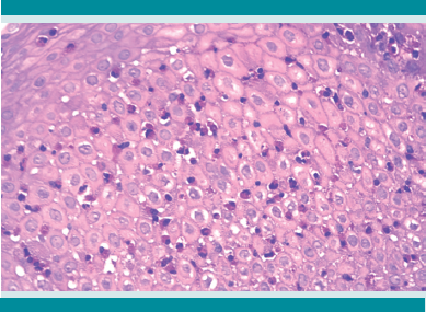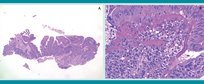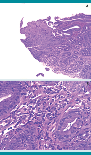 Se recibieron como biopsias de esófago dos fragmentos pequeños de tejido que, en conjunto, midieron 0.3 x 0.2 x 0.2 cm, marrón claro, de consistencia blanda. Los cortes histológicos mostraron epitelio esofágico con leve hiperplasia de la capa basal, con denso infiltrado inflamatorio eosinofílico; se contaron más de 25 eosinófilos por campo a seco fuerte (Figura 1). En el cardias también se encontró infiltrado eosinofílico (Figura 2). La biopsia del antro no mostró eosinofilia, solo edema leve. En el duodeno se encontró infiltrado eosinofílico moderado, hasta 12 eosinófilos por campo a seco fuerte. Figura 3