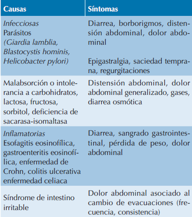 Las infecciones parasitarias, como Giardia lamblia . B hominis son causa de dolor abdominal crónico, y por el proceso inflamatorio generan intolerancia a la lactosa que puede agravar aún más el cuadro. En los últimos años se menciona que B hominis se relaciona con padecimientos alérgicos, por lo que en este caso puede ser un factor implicado en los síntomas.4,5