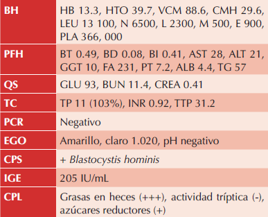 Como datos positivos, en la biometría hemática se reportó eosinofilia, que puede orientar a datos de atopia o parasitosis. La IgE elevada y el examen coproparasitoscópico con Blastocystis hominis. La panendoscopia se reportó normal, sin evidencia de esofagitis o gastritis.