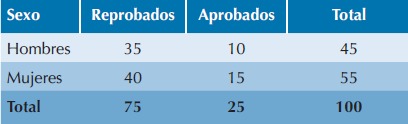 • Proporción: 46.6% de los reprobados en el curso eran hombres [35/75 = 0.466]