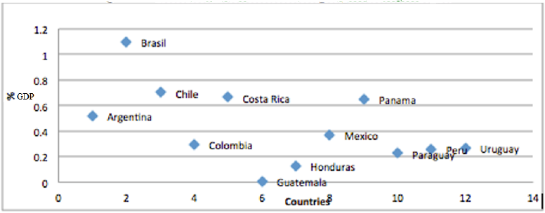 Figure 1 shows that the greatest effort in R&D investment in Latin America is done by Brazil, followed by Chile, Costa Rica, Panama, Argentina and Mexico; however, the differences between Brazil and the other Latin American countries are notorious as Brazil doubles the research intensity of most Latin American countries. Brazil spends 1.1% of its GDP on R&D and is the pointer in Latin America; however, it is still far from global leaders such as Israel and Sweden that spend 4.5% and 4.2% of their GDP, respectively.