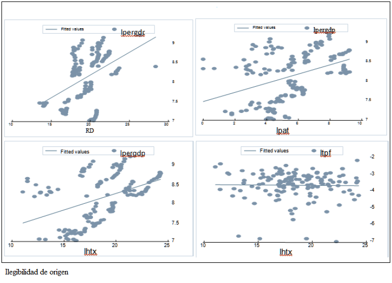 Figure 2 shows that an increase in technological variables has a positive impact on per capita real income. The upper left graph indicates that an increase in investment in R&D raises per capita income. The upper right graph indicates that as the number of patents increases, so does the per capita income. The lower left graph shows that an increase in exports with high technology content leads to an increase in per capita GDP. Finally, the lower right graph indicates that exports of high technological content have little impact on TFP. It is noted that despite the increase in investment in R&D in the region, the effort is poor compared to most developed countries and even in comparison with China. Finally, figure 2 shows the largest impact investment in R&D in the growth rate of per capita GDP compared with the number of patents and high-technology exports.