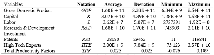 The data used in this research was obtained from the World Bank. Gross domestic product (GDP) is the dependent variable, and the rest of the variables will be the independent variables. These are expressed in U.S. dollars in the purchasing power parity in 2000, except variables such as labor and patents that are measured in units. For the econometric analysis, it will be considered a balanced panel data (same number of observations for all countries and all variables) to estimate a dynamic model; the period is restricted to available data. The panel includes twelve Latin American countries in the period 1996-2008. Below are the descriptive statistics of the studied variables.