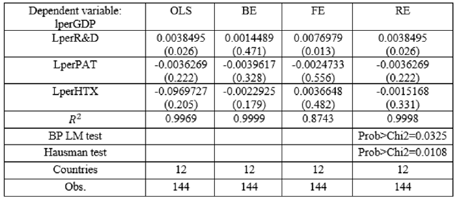 This research focuses on a sample of twelve Latin American countries: Argentina, Brazil, Chile, Colombia, Costa Rica, Guatemala, Honduras, Mexico, Panama, Paraguay, Peru and Uruguay. The analyzed variables are expressed in logarithms of per capita real GDP (lperGDP), per capita investment in R&D (lperR&D), per capita number of granted patents (lperPAT) and per capita high-technology exports (lperHTX). The period under study is 1996-2008, which provides a total of 144 observations. The econometric package Stata.11 will be used to estimate a balanced panel. The main results are shown in Table 2.