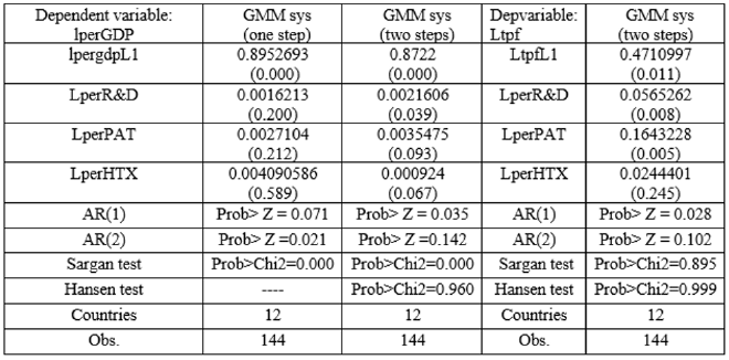 Table 3 shows the estimation results of the dynamic panel data regression. As before, the first column indicates that the dependent variable is the logarithm of per capita real gross domestic product. The explanatory variables are the lag of the logarithms of per capita real gross domestic product, per capita investment in R&D, per capita number of patents and the per capita high-technology exports. Tests of serial correlation of the first and second orders, and the Sargan and Hansen tests were carried out.