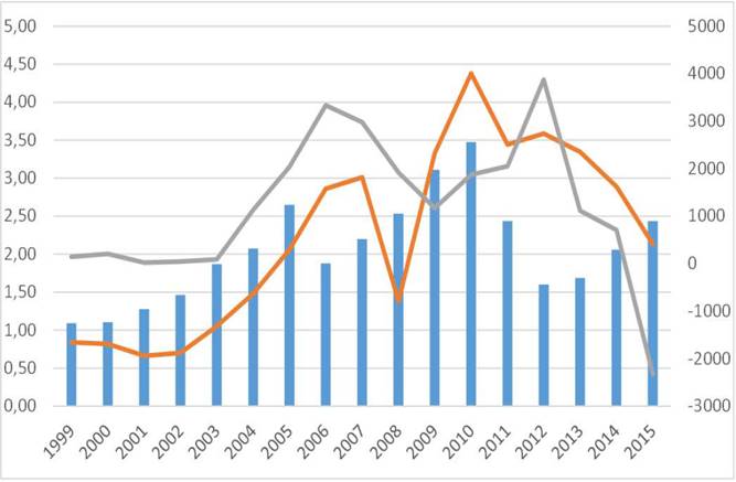 CODELCO is therefore an important player in the Chilean economy, geared to international trade and is dependent on the exports of raw materials. From the 1960s until now, exports represented 21.1% of Chile’s GDP, reaching in recent years to about 30% (Graph 1, Appendix). Within exports, the ones corresponding to copper have a ponderous weight. In the period 2010-2014, they reached 54% of total exports (Graph 2, Appendix). Of these, approximately one third of the production, corresponds to CODELCO (Graph 3, Appendix). Also plays a key role in tax collection. As shown in another study, the company fulfils the role of generating revenues to the treasury and, in fact, there is no other company that delivers such amount resources (see Barría, 2015). They are derived from taxes on profits that every company must pay (20%), a tax of 40% for SOEs (Decree Law 2,398), along with a variable royalty payment (between 5 and 14 %, law 20,469) and a 10% tax on exports (law 13,196). To this the contributions established by the Copper Reserved Law must be added. (Graph 4, Appendix).