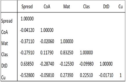 With respect to liquidity risk, the variables are Cash over Total Assets and Maturity. Cash over Assets is defined as the ratio of the sum of cash and short - term liquidating assets regarding total assets, and indicates the issuer’s ability to meet its short - term financial obligations. A high level of cash available on total assets indicates a profile with high liquidity in the funds available by the issuer. In general, it is expected that this variable is negatively related to the interest rate spread, assuming that low liquidity of the issuer implies that when paying their obligations they could also face high levels of financial stress. However, a level of cash on excessively high asset may represent high inventory costs, which in some cases could lead that above some level, a high level of cash implies an increase in the spread. For model we used the result of the ratio between cash and short -term liquidating assets to total assets, for each quarter.