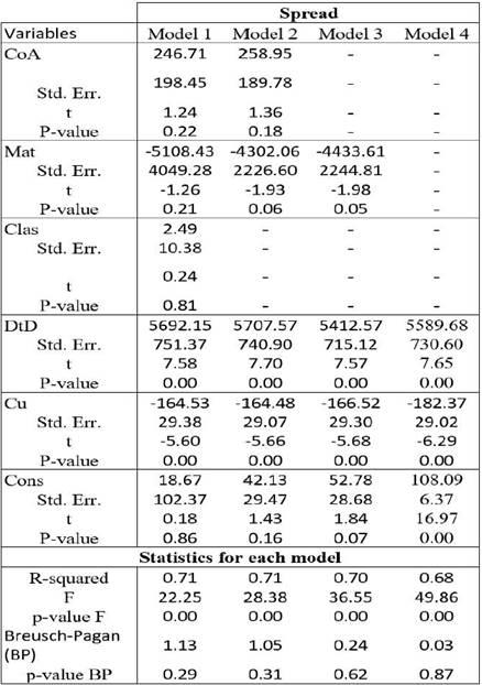 Finally we can conclude that is possible to eliminate of the model Cash to Total Assets due to a lack of statistical significance and Maturity and Risk Classification due to both problems, the presence of a unit root in the data and because there are not statiscally significant. Then, we can choose Model 4, although it determination coefficient is around 68%, it is the strongest model from a methodological point of view, because it is estimated through the White method, which applies robust errors to the presence of heteroskedasticity, does not consider variables that have multicollinearity problems and does not include variables with unit root problems.