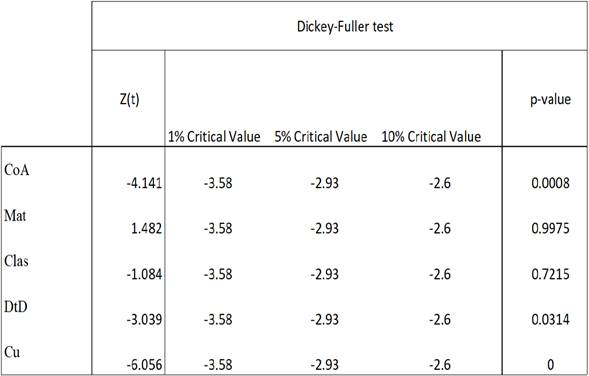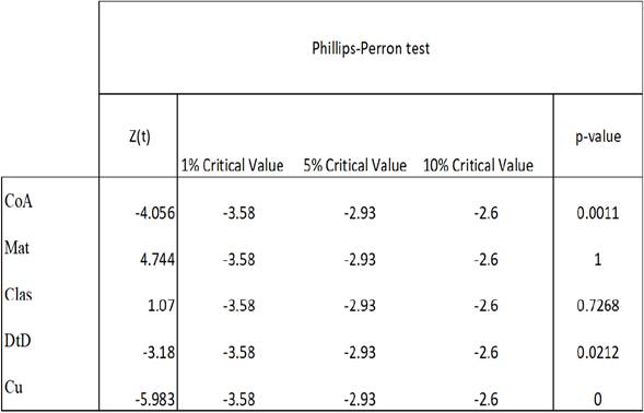 In addition to the statistical significance of the variables, we have a second reason for not taking into account variables as Maturity and Risk Clasification, due to that these time series variables possess unit root problems. It can be seen in the following table, where we show the results for Phillips-Perron and Dickey Fuller tests.